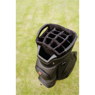 Avec 9 poches de rangement, une bandoulière rembourrée, un panneau avant zippé personnalisable et une housse pour parapluie, le sac de chariot NERO a une place pour chaque essentiel de golf.